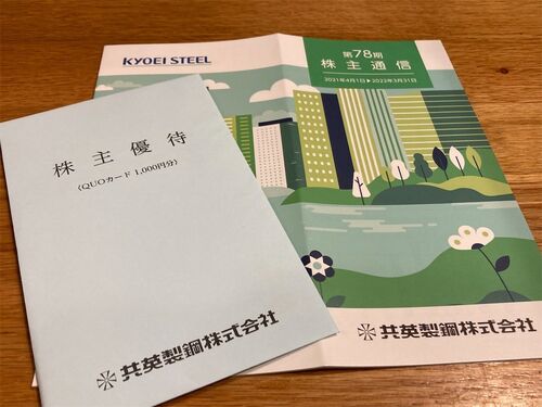 引き続き3月決算銘柄が続きます。今回は共栄製鋼という会社から株主優待のクオカードと業績報告書が届きました。 共栄製鋼の株主優待制度は? 共栄製鋼の株主優待制度は下記のようになっています。 QUOカード100株以上 1年未満:1,000円分 1年以上:2,000円…